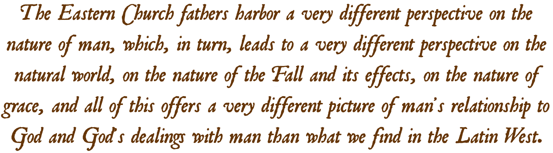 The contrast between how the East and West see man is no less stark than the contrast in the doctrine of God. Within the Latin West, the Pelagian dispute marks a defining moment in how Augustine of Hippo and Latin writers after him come to see the nature of man, of sin, and of grace. From this point onward, Pelagianism becomes a redline that none might cross without charge of heresy. The result definitively shapes Western thinking about the natural world, about the nature and effects of the Fall, and the nature of the grace required to remedy these effects. And the results, in turn, shape Latin thinking about man’s relationship to God and God’s dealings with man. Once again, however, this uniquely Latin discussion is alien to Eastern Christianity. The Eastern Church fathers harbor a very different perspective on the nature of man, which, in turn, leads to a very different perspective on the natural world, on the nature of the Fall and its effects, on the nature of grace, and all of this offers a very different picture of man’s relationship to God and God’s dealings with man than what we find in the Latin West.