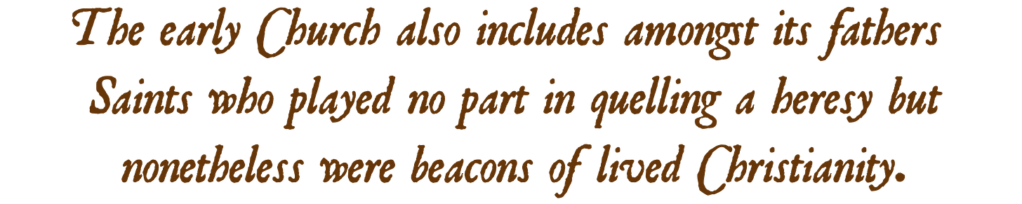 However, the early Church also includes amongst its fathers Saints who played no part in quelling a heresy but nonetheless were beacons of lived Christianity. The Desert Fathers are the most obvious example. These fathers are so named because they retreated to the desert in order to put to death the passions, embodying renunciation of the world, the mortification of the passions, and complete devotion to God in ceaseless prayer. Yes, such monastics would, from time to time, find themselves pulled from their caves to aid in putting to death a heresy, but such was not required for these to be deemed fathers of the Church. Hence, the annals of the Church fathers is not limited to those apologists and theologians who championed orthodoxy over heresy, but includes those Saints who championed orthodoxy by way of their Saintly example.