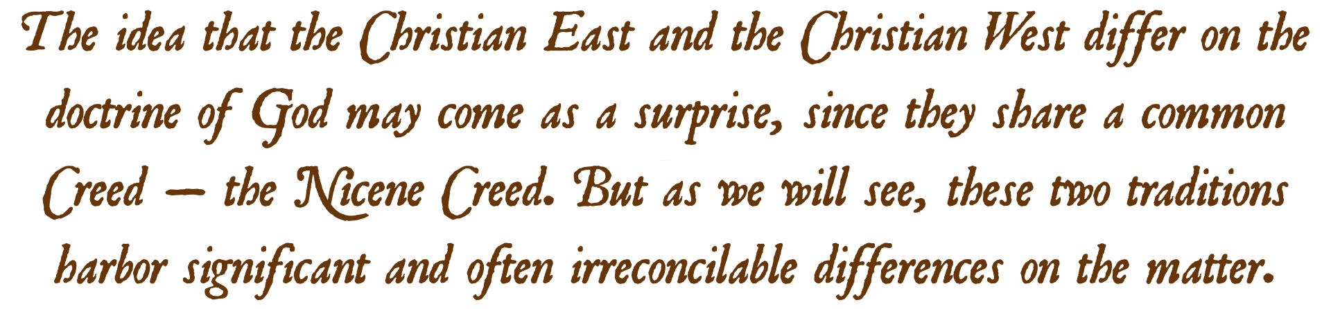 Perhaps surprisingly, I find something similar at work in Roman Catholic polemics. For example, when discussing the filioque — that is, whether the Holy Spirit proceeds from the Father (the Orthodox view) or from the Father and the Son (the Catholic view) — Catholic apologists will often catalogue passages from the Eastern fathers that speak about the Holy Spirit proceeding from the Father through the Son as proof of the Catholic position. But such polemics fail to recognize the more fundamental disagreements about the doctrine of God and the Trinity that precede this question. Without acknowledging these more basic differences, the very same passage that requires dual procession from the Roman Catholic view is utterly irrelevant to the question for the Eastern Orthodox reader. Once again, while rebutting such readings is not the concern of these lectures, the sorts of fundamental differences to which I here refer will become evident throughout this series.