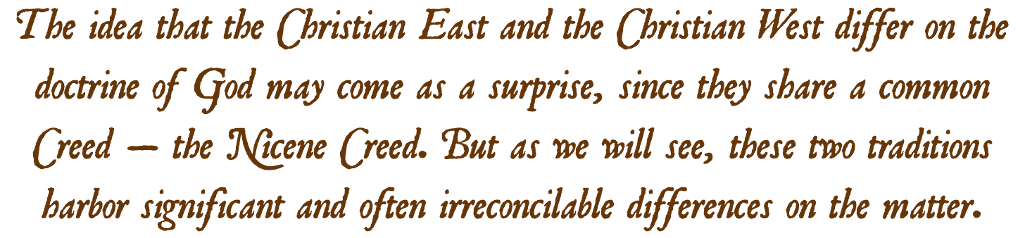 The idea that the Christian East and the Christian West differ on the doctrine of God may come as a surprise, since they share a common Creed — the Nicene Creed. But as we will see, these two traditions harbor significant and often irreconcilable differences on the matter. Within the Latin West, a particular brand of “divine simplicity” is first planted by Augustine of Hippo and then grows into full bloom in Anselm of Canterbury and the medieval scholastics after him. This doctrine affects how Augustine and Latin writers after him use the word “God” (deus), how they understand the Trinity, how they interpret the divine attributes, and a host of other things. Truthfully, the cascading effect can hardly be overstated. And yet, as we will see, the doctrine of simplicity that proves fateful for the Latin West — along with its reverberations throughout the doctrine of God — is wholly alien to the Eastern Church fathers. As a result, a great chasm emerges between how the East and the West understand divine simplicity, the divine attributes, and even the Trinity itself. So, despite a common Creed and an overlapping vocabulary that gives the impression of common doctrines, the resulting teachings about God are vastly different.
