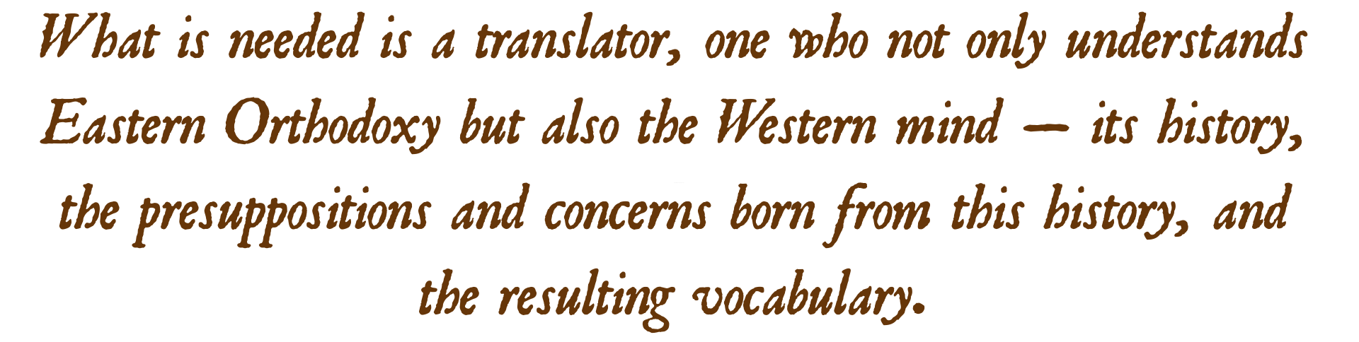 In short, the two parties often talk past one another. What is needed is a translator, one who not only understands Eastern Orthodoxy but also the Western mind — its history, the presuppositions and concerns born from this history, and the resulting vocabulary. Only by understanding such things, can one translate the Eastern doctrines into terms that make sense to the Western mind. Such translation work is the goal of the present series.