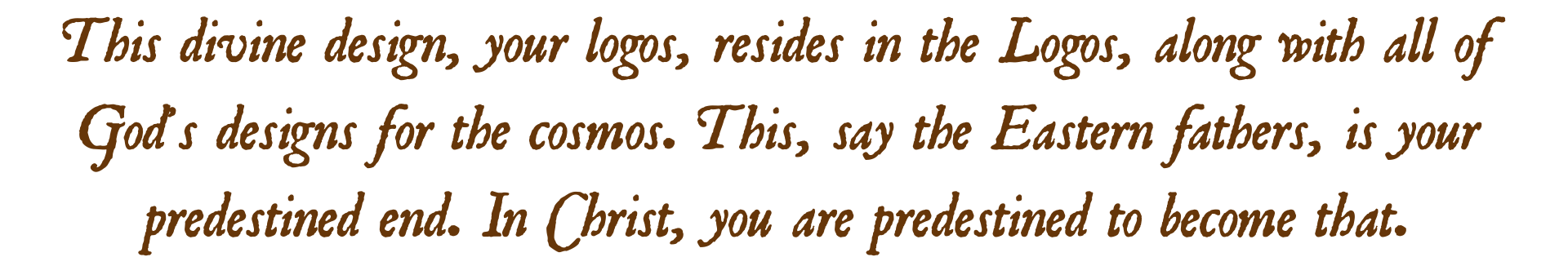 The importance of this doctrine is that God’s designs include an archetype of what each one of us is made to become, our idyllic self -- you and I as Saints. This divine design, your logos, resides in the Logos, along with all of God’s designs for the cosmos. This, say the Eastern fathers, is your predestined end. In Christ, you are predestined to become that.