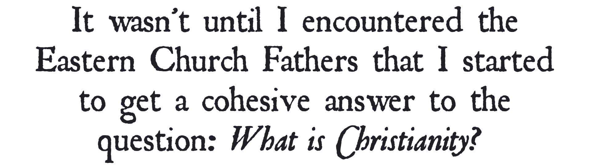I wondered, “Is Christianity anything at all? What is this religion that was handed down?” It wasn’t until I encountered the Eastern Church Fathers that I started to get a cohesive answer to the question: What is Christianity? Because all of the Eastern Church Fathers, when I started reading them, I saw that there was a cohesive understanding of this vision of Christianity, of the worldview, of the Trinity, of Christology, of the Gospel, and so on.