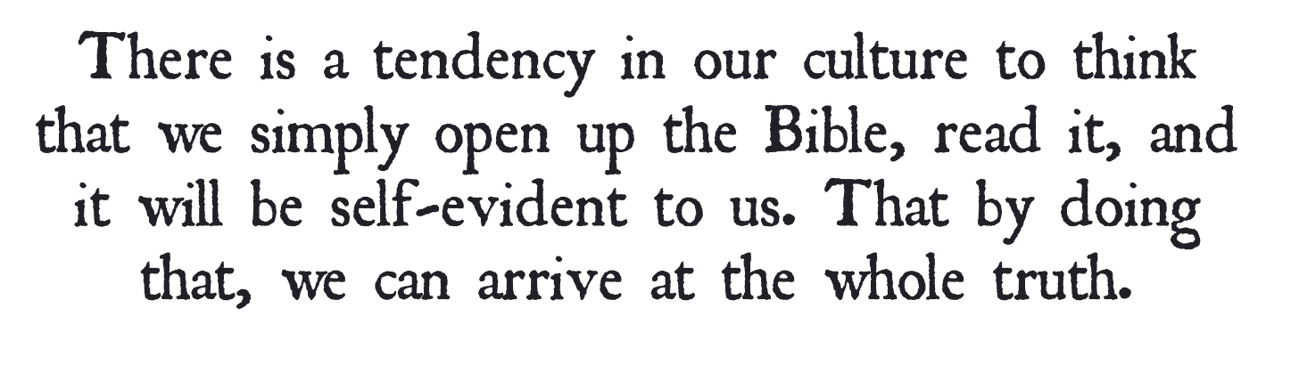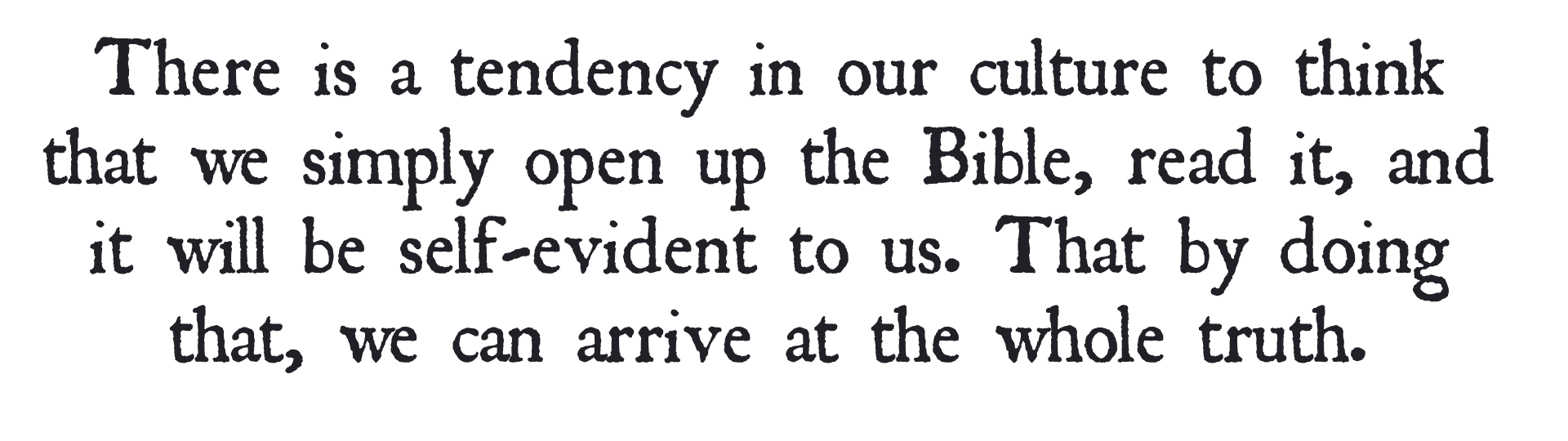 The irony was there was this detaching of the biblical text—this pulling of the biblical text from the hands of the church and of councils and of Church Fathers and of tradition and all the rest—only to rebuild a new church, a new denomination, with its own confessions, with its own theologians (or fathers, you might say), with its own dogmatic commitments and so on to provide a guide for how you should go ahead and read the biblical text. And there might be a caveat that says, “Yes, of course, we might be wrong. We are fallible,” but still, in practice, there is a tendency to say, “These are the commitments of the denomination. This is how we are committed to reading the biblical text. And so if you’re going to be one of us, you have to affirm this interpretation of the biblical text because these are the dogmatic guidelines that we ultimately have.”
