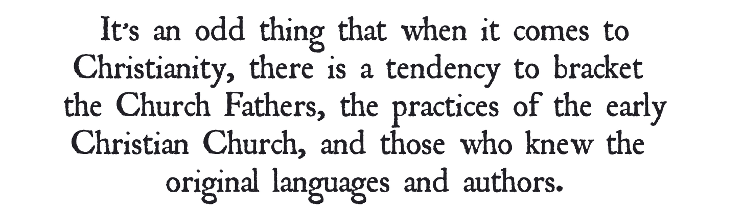 It’s an odd thing that when it comes to Christianity, there is a tendency to bracket the Church Fathers, the practices of the early Christian Church, and those who knew the original languages and authors. These were the very recipients, protectors, keepers, and practitioners of what was handed down as original Christianity, yet they often get set aside. We then delve into the biblical text, divorced from that very valuable historical context.