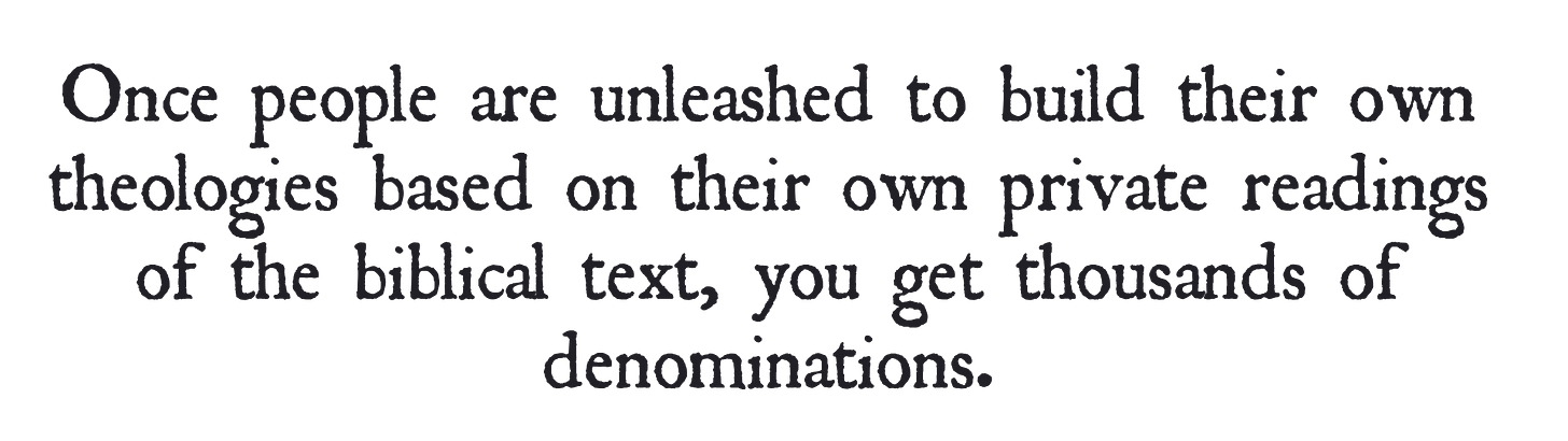 The problem, of course, is that in practice, while all of that makes sense, we’ve seen the fruit of how that plays out. Once people are unleashed to build their own theologies based on their own private readings of the biblical text, you get thousands of denominations. Every person has their own reading, and those readings don’t align. So, the hope that somehow if we all get out our Bibles and get out our lexicons, and we start to do sentence diagramming, and we treat the biblical text like data to be broken down and analyzed, we’ll get to the truth and we’ll all be on the same page, obviously proved to be false.